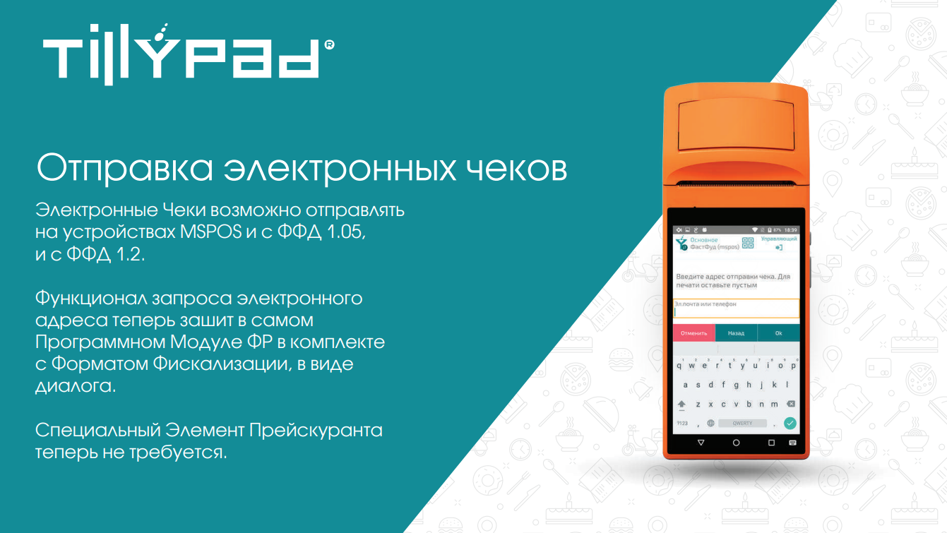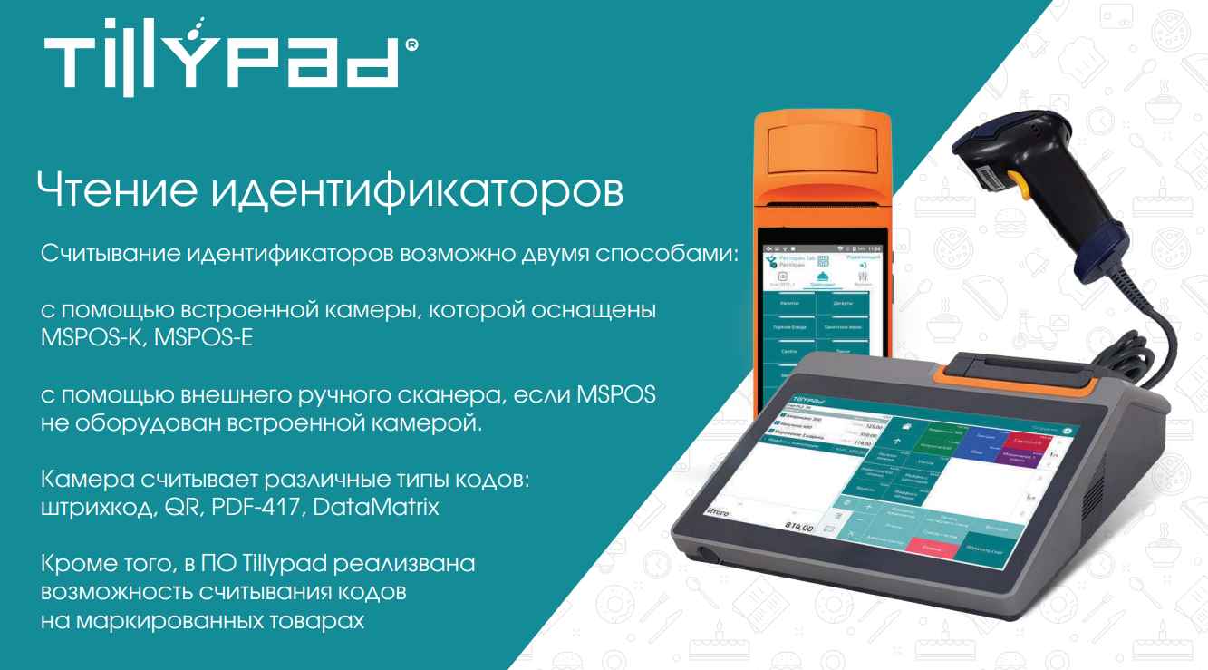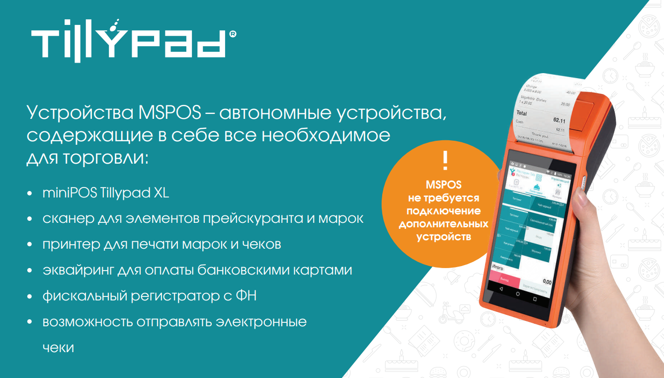 Устройства MSPOS - это автономные устройства, содержащие в себе все необходимое для торговли – приложение miniPOS от Tillypad, принтер для печати марок и чеков, сканер для сканирования идентификаторов элементов прейскуранта, постоянных клиентов, а также марок для маркированного товара, фискальный регистратор с ФН для оплаты, возможность отправлять электронные чеки, эквайринг для оплаты банковскими картами (или возможность подключения внешнего эквайринга).