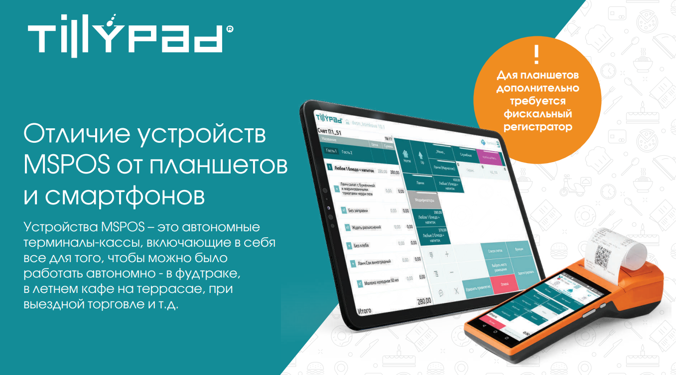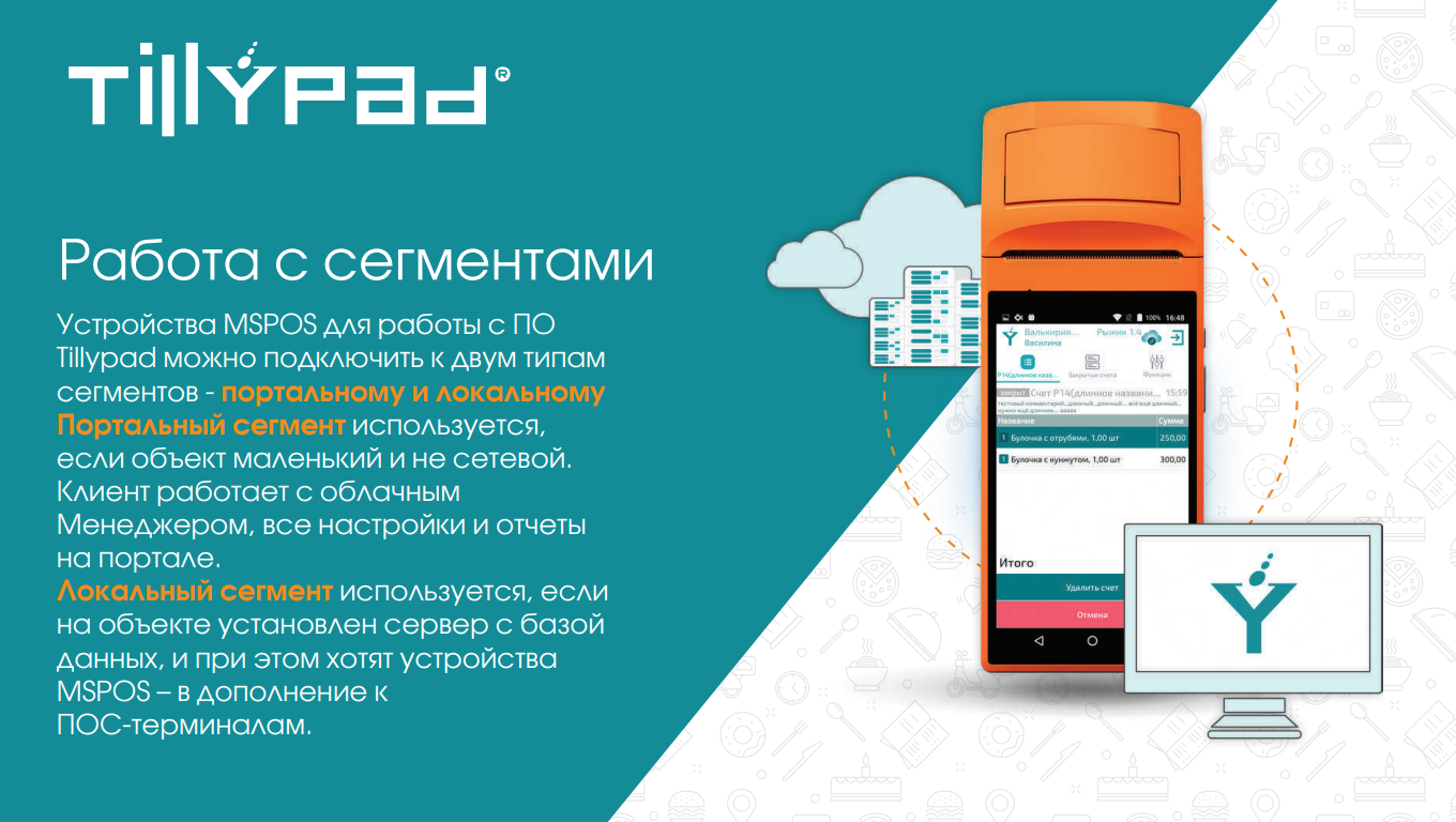 Устройства MSPOS для работы с ПО Tillypad можно подключить:- к портальному сегменту,- к локальному сегменту.К портальному облачному сегменту подключают MSPOS, когда объект – маленький, как правило, не сетевой. База данных расположена в облаке, клиент работает с облачным Менеджером, подключаясь в браузере. На объекте – только устройство MSPOS.К локальному сегменту подключают MSPOS, когда на объекте установлен сервер с базой данных, и при этом хотят устройства MSPOS – в дополнение к ПОС-терминалам (например, открыли летнее кафе, участие в выездных ярмарках и проч.) или вместо ПОС-терминала (не хотят отдельно закупать принтеры и фискальные регистраторы, но зато хотят повысить мобильность официантов в заведении).