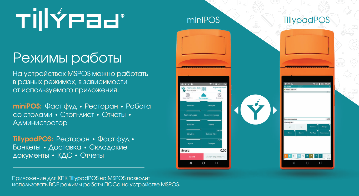 В приложении miniPOS на устройствах MSPOS можно работать в режимах:- Фастфуд- Ресторан. Работа со столами- Стоп-лист, с обратным отсчетом оставшихся блюд- Отчеты